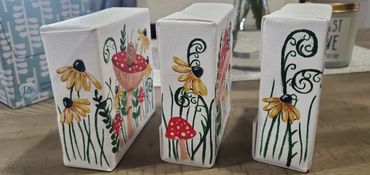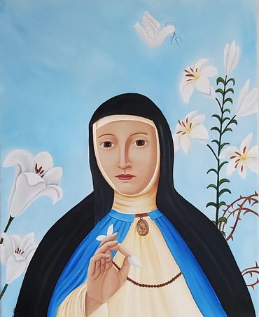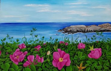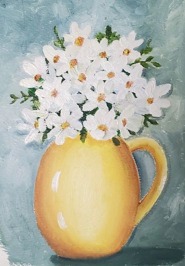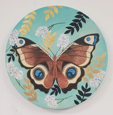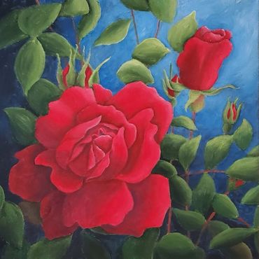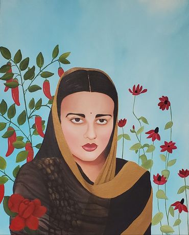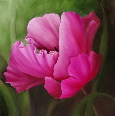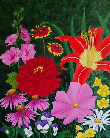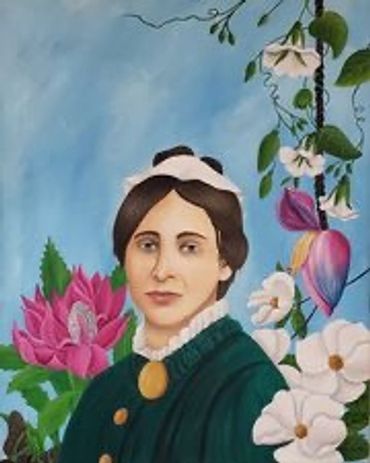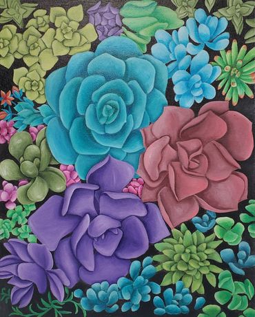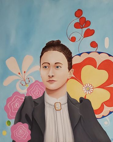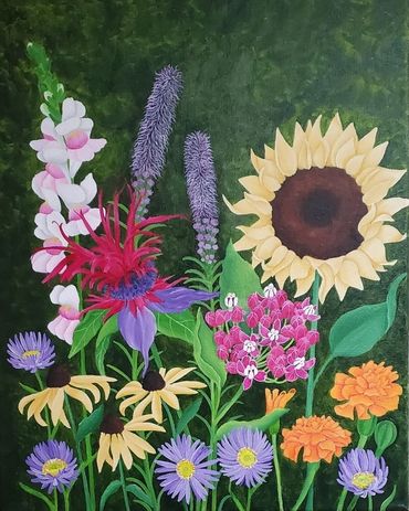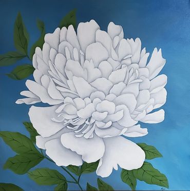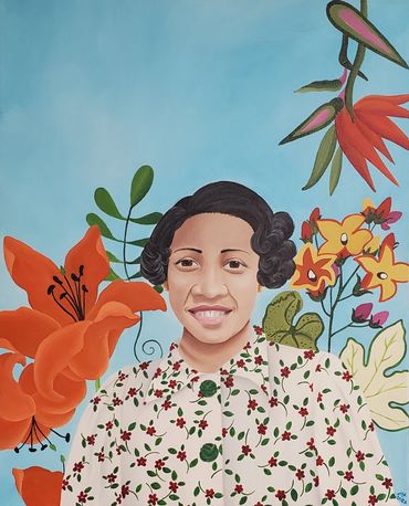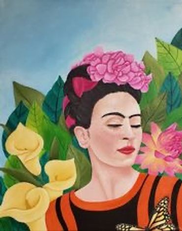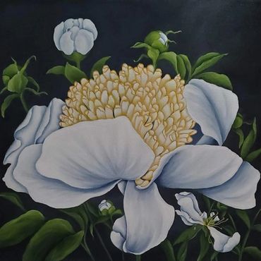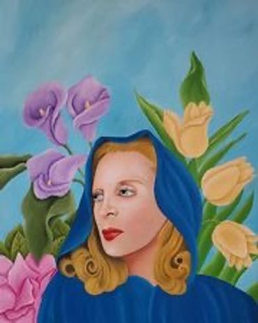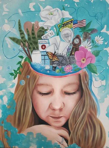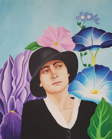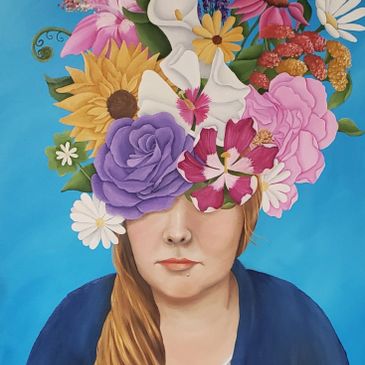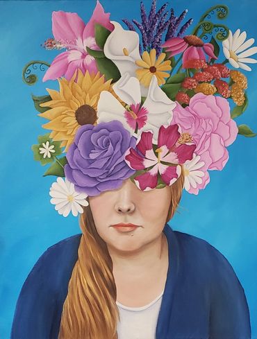 I have always enjoyed the therapeutic process of creation and wanted to share the healing energy of art with others. After all that is thrown at us through the news, social media, and advertising, I wanted my art to be the pause, the deep breath, and the calm. But during COVID, when many of us were forced into a debilitating pause, art was once again my savior. What began as a few pieces honoring female painters, prior to 2020, turned into a continuing series of nearly a dozen works. They gave me the courage to finish my own self-portrait entitled, “See No Evil.” I have always been fascinated with the language of flowers and they have been dominate in my work. Following this theme, blooms became an integral part of this series and each piece includes the artist surrounded by flowers plucked directly from their own work. My self-portrait “See No Evil” is comprised of flowers that represent my family and friends. They cover my eyes and shield me from the horrors of the world. In the unprecedented year of 2020, the mass shooting of 23, and all the major moments in our lives, it is our friends and family who are most important, and who despite everything close by or far away, in person or online, are our shield, our pause, our deep breath and our calm.